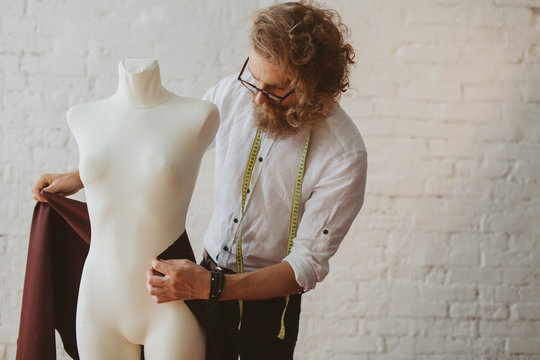 Man working with fabric and mannequin