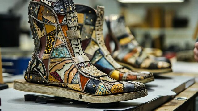 Cobblers creating orthopedic footwear, detailed design process and vibrant materials, dynamic focus on functionality and traditional craftsmanship