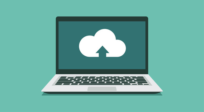 Isometric laptop or notebook with icon or symbol of cloud technology. Progress upload and download data information in cloud storage of corporation network and sharing of data . Conceptual banner.