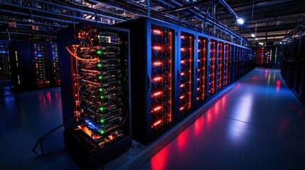 Futuristic data center corridor illuminated by blue and red lights, showcasing technology