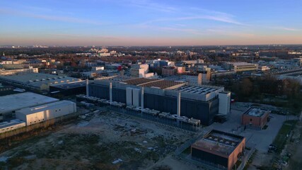 Large modern data center building providing essential services for artificial intelligence and cloud computing. Lovely aerial view panorama overview static tripod hovering drone
