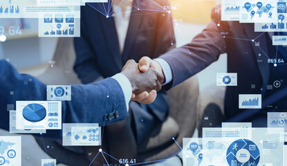 Multinational business people shaking hands and business data concept