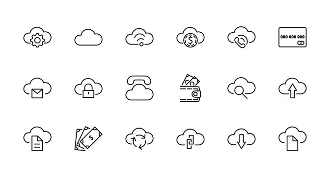 Set of cloud vector line icon. It contains symbols to upload, download, link and more. Editable Stroke. 32x32 pixels.