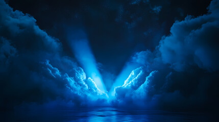 Illuminated stage with scenic lights and smoke. blue spotlight with smoke volume light effect on black background. stadium cloudiness projector, generative ai. Illuminated. Illustration