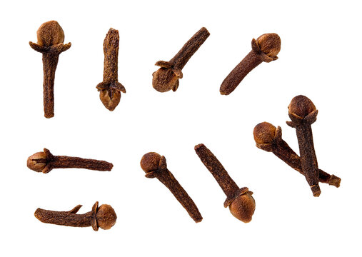 Set of whole organic clove buds cutout. Macro. Variety of dry organic cloves spice isolated on a white background. Concept of cooking and herbal medicine.