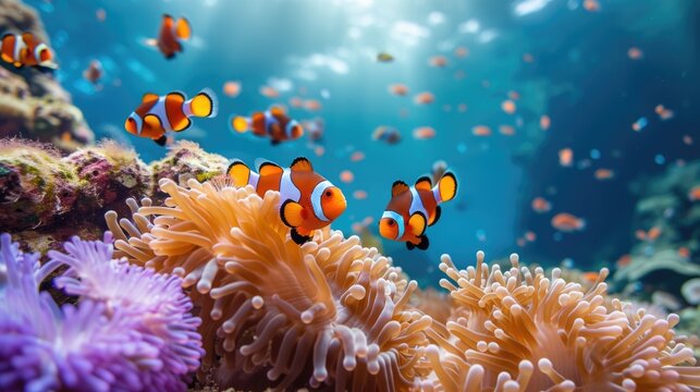 Four bright orange and white clownfish swim among colorful anemones in a vibrant coral reef aquarium