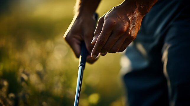 Golf Course Green, Golfer Hands Gripping Club at Sunset - Leisure Sport Game