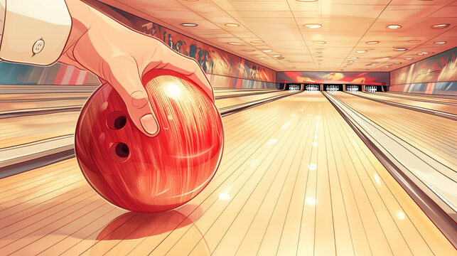 Person gripping a bowling ball at a vibrant bowling alley