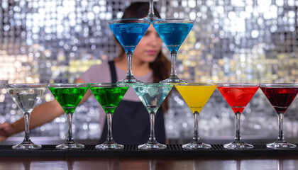 Many dark bottles filled with red wine stand in neat row. Warm ambient light creates soft bokeh effect in blurred background. Elegant collection highlights premium drink experience for special event