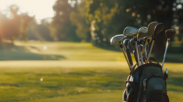 Explore the perfect golf experience a stylish bag with clubs next to a lush green golf course