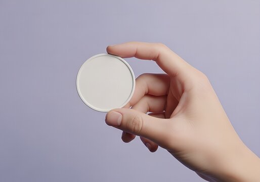 Close-up of a person's hand holding a small circular white object against a soft purple background.