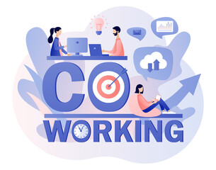 Co-working space. Shared working environment. Tiny people working on laptops, computers, smartphones on shared modern office workplace. Modern flat cartoon style. Vector illustration