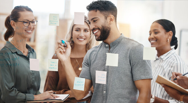 Corporate team brainstorming strategy development on glass wall