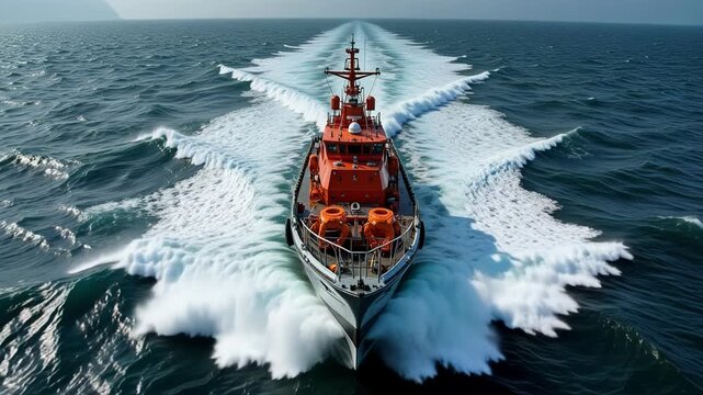 Dramatic Coast Guard Rescue at Sea: Ship Battling Rough Waves During Urgent Operation, Thrilling Aerial View of Maritime Emergency