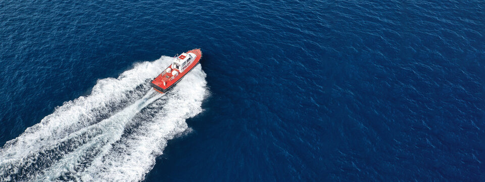 Aerial drone ultra wide photo of small pilot vessel cruising near mediterranean port with deep blue sea