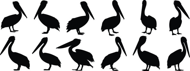 Pelican silhouettes, bird shapes, coastal wildlife, seabird outlines, flying pelican, marine bird, nature design, avian icons, tropical fauna, vector illustration