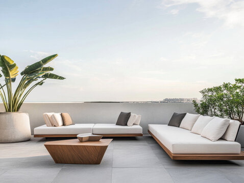 Modern outdoor lounge with stylish seating and greenery overlooking a coastal view at sunset