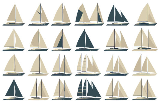 Different types of sailboats on water with varying sail positions and designs in a simple layout