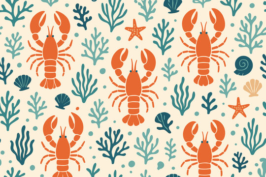 Lobster seamless pattern vector illustration. Retro marine background with stylized orange lobsters, seaweed, shells, starfish. Underwater ocean life wallpaper. Seafood textile print design.