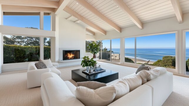 Wooden table top against a blurred setting of a coastal living room with ocean views, ideal for advertising presentations and product displays.