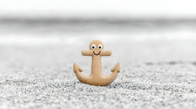 Happy anchor figurine on sandy beach, ocean background, summer vacation concept