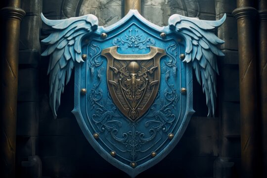 Coat of arms crest knight family medieval shield heraldry heraldic armorial motif. Featuring a knights helm helmet in a vintage etching engraving woodcut style
