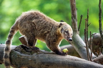 Cute coati climbing a tree, against natural background, Iguazu, Misiones, Argentina