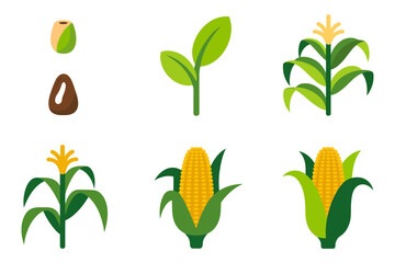 Corn plant growth vector illustrations, seed sprouting stalk leaves cob development stages, agriculture farming icons, botanical crop graphics