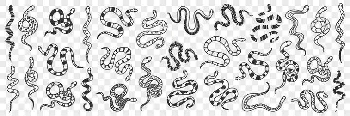 Various snakes of different patterns doodle set. Collection of hand drawn wild snakes cobra python wriggling on ground ready to bite isolated on transparent background