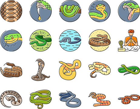 snake black serpent viper cobra icons set vector. python anaconda, animal tattoo, cute mamba, skin reptile, jungle wild snake black serpent viper cobra color line illustrations