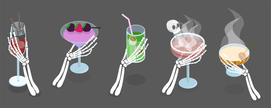 3D Isometric Flat Vector Illustration of Halloween Drinks, Collection Of Skeleton Hands Holding Spooky Halloween Coctails