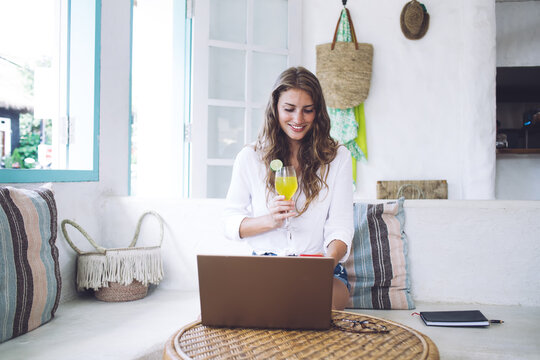 Positive woman drinking refreshing cocktail while using smartphone at home