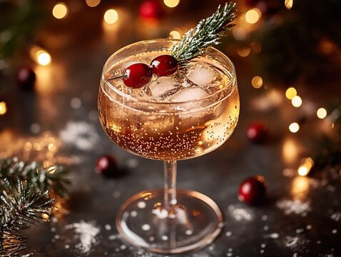 A sparkling cocktail garnished with cranberries and herbs, set against a backdrop of festive lights and decorations.