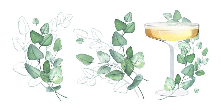Set of champagne glasses with eucalyptus branches. A sparkling wine. Glamorous drink. Watercolor illustrations on isolated white background. For the design of cards, invitations, posters.