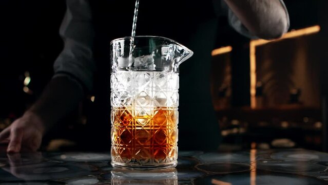 Close up of a professional bartender is mixing an alcoholic cocktail with professional crystal long lasting ice cubes to customers at the bar or disco club.