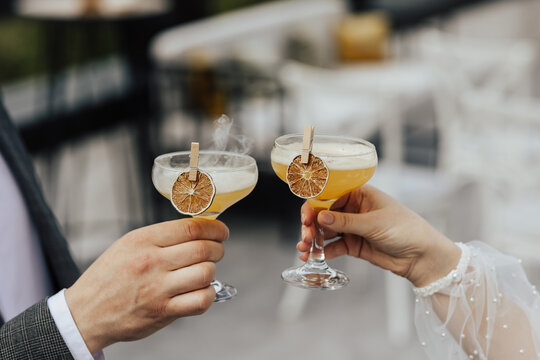The bride and groom hold glass glasses with an alcoholic cocktail in their hands, whiskey in their hands at a party. Wedding photography, portrait.
