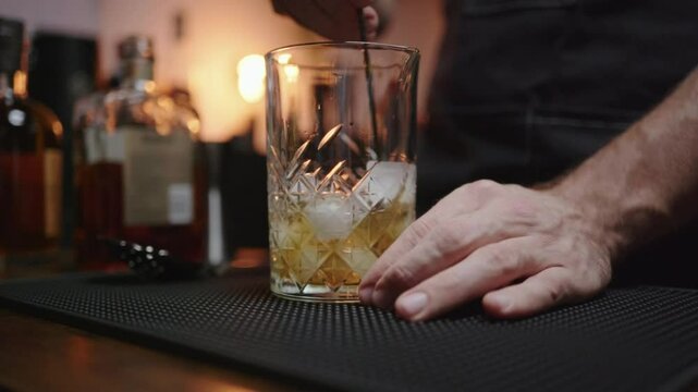 Home bar cocktail making with ice and glass stirring. Great for bartender training or mixology tutorials.