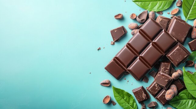 Dark chocolate and leaf on wooden surface with celebration text