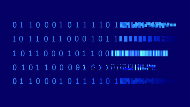 Vector binary code is transforming to the pixels, colorful blue illustration, design elements set.
