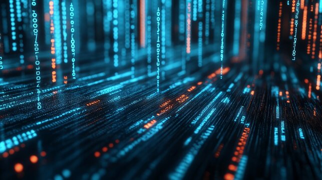 a high-tech array background with a matrix of data points and binary code illuminated against a dark,, Digital data stream of blue numbers and code flowing in the dark space,