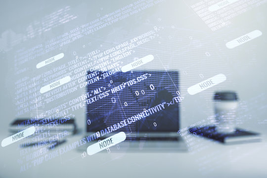 Abstract creative coding concept with world map on modern laptop background. Multiexposure