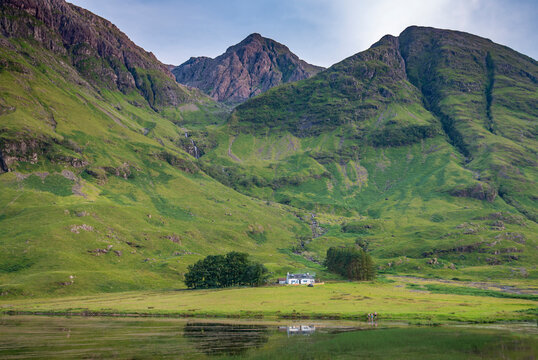 Small white cottage below magnificent mountains next to Loch Achtriochtan ,Glencoe,Scotland,UK.