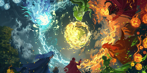 Unity of the Elements - A beautiful assemblage of distinct elemental beings forms an intricate pattern, showcasing their harmonious coexistence