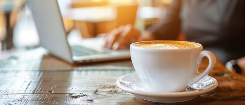 Office worker on a coffee break purchasing online, candid shot with laptop, soft focus on background cafA
