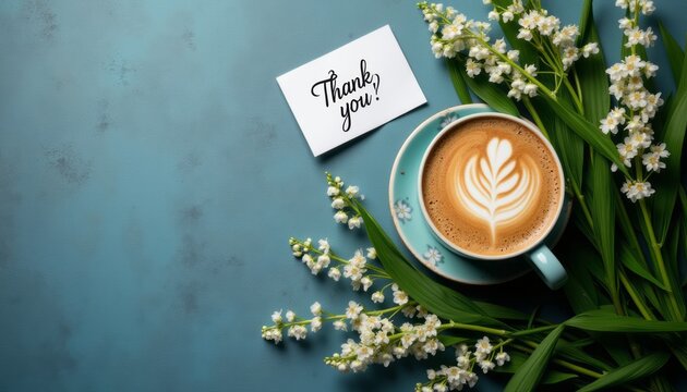 A beautifully arranged scene featuring a cup of coffee adorned with intricate latte art, accompanied by a heartfelt Thank you card and delicate white flowers. The soothing blue background enhances the