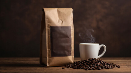 Craft paper coffee cup mockup and coffee beans, blank  top view isolated on white background. Copy space. Coffee take away branding mock up template
