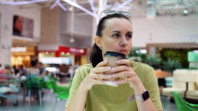 A woman at a food court table in a shopping mall drinks coffee from a cardboard cup.