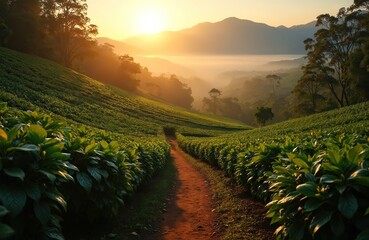 Serene Sunrise Over Lush Coffee Plantation in Central America with Rolling Hills and Golden Light