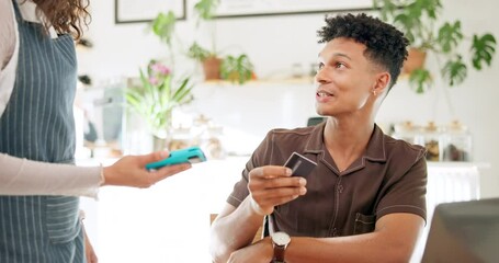Man, pos and credit card for payment in coffee shop, ecommerce and transaction on electronic machine. Black person, digital scanner and customer for tap purchase, internet currency and online service