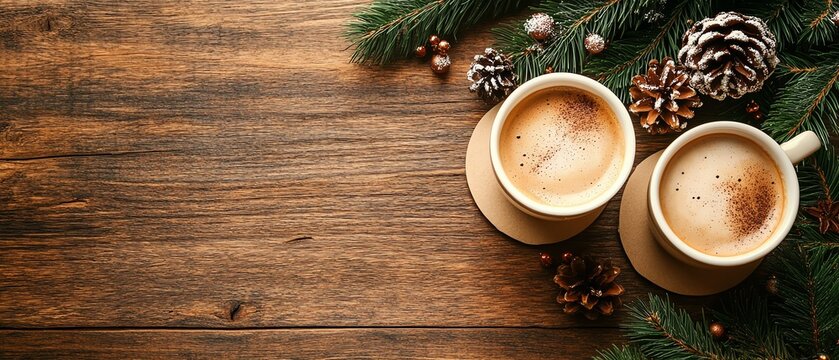 Top view of a wooden table with coffee cups, round beige carton coaster, Christmas vibe, festive decorations